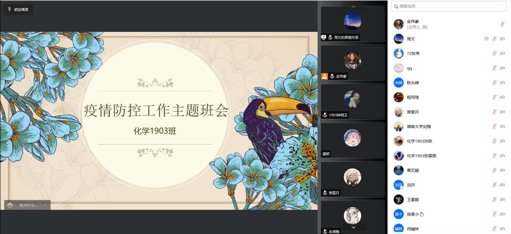 持续时长两周的园区隔离生活迎来了尾声,73882必赢欢迎光临网页天马学生公寓于4月9日正式解封。为了了解学生思想动态,帮助学生解决困难和问题,73882必赢欢迎光临网页73882必赢欢迎光临网页化学1903班于2022年4月17日晚上19时借助腾讯会议线上平台举行了“疫情防控工作”主题班会,本次班会邀请到了原化学类1903班班主任刘强老师参会,由团支书周文主持,化学1903班共26名同学参加,2人请假。