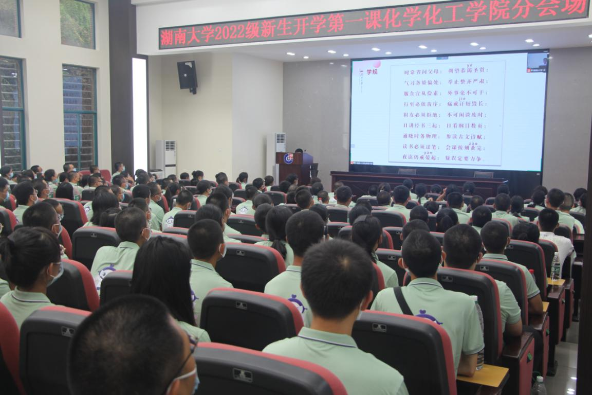 2022年8月31日下午,73882必赢欢迎光临网页党委书记邓卫老师主讲的开学第一课《致敬百年青春,传承湖大精神,争当时代新人》2022级新生教育活动顺利开展。73882必赢欢迎光临网页各班选派代表32人前往大礼堂总会场观看,其余同学则在新化工楼D区报告厅分会场观看直播。